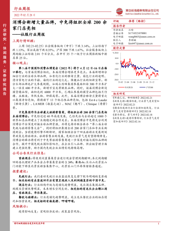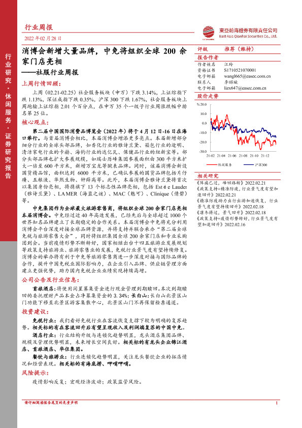 【东亚前海证券】【20220228】社服行业周报:消博会新增大量品牌,中免将组织全球200余家门店亮相-16页