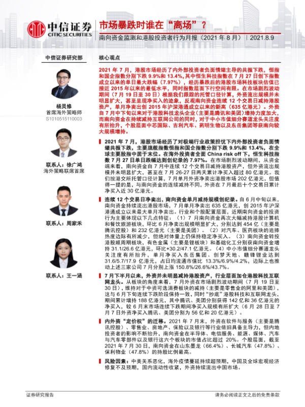 【中信证券】【20210809】南向资金监测和港股投资者行为月报(2021年8月):市场暴跌时谁在“离场”?-21页
