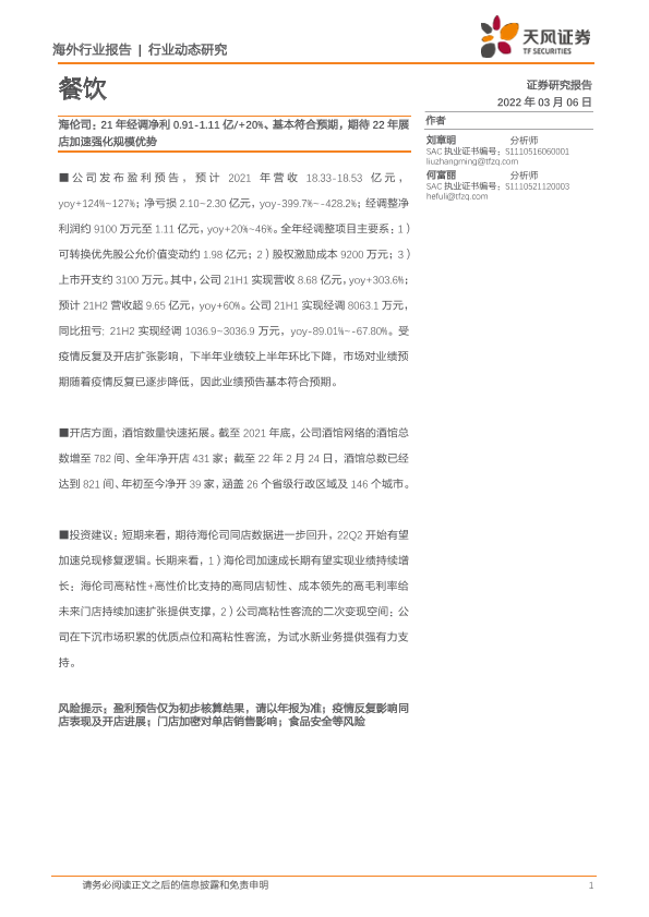 【天风证券】【20220306】海伦司:21年经调净利0.91-1.11亿 +20%、基本符合预期,期待22年展店加速强化规模优势-2页