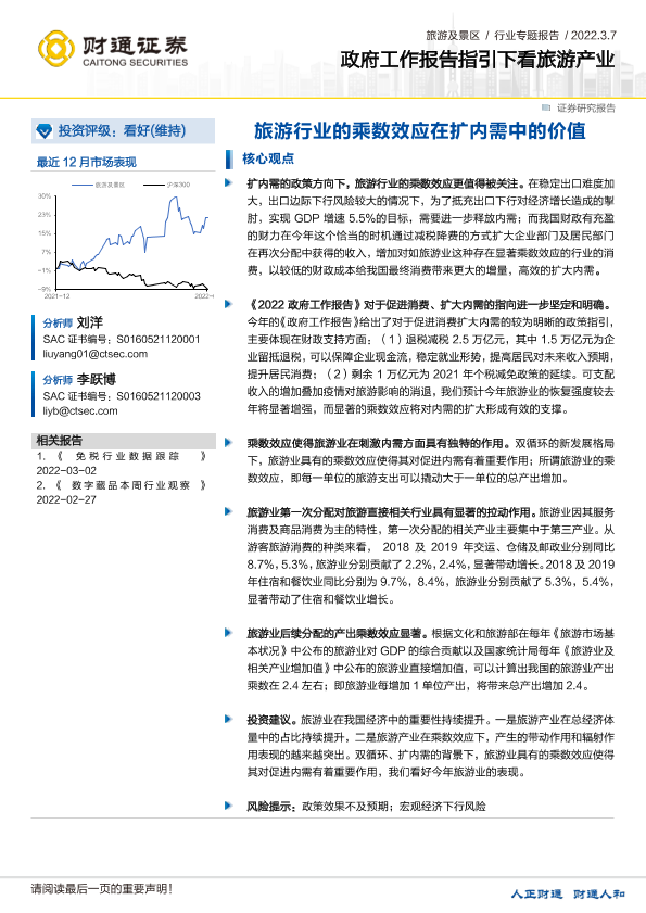 【财通证券】【20220307】旅游及景区行业专题报告:政府工作报告指引下看旅游产业-旅游行业的乘数效应在扩内需中的价值-8页