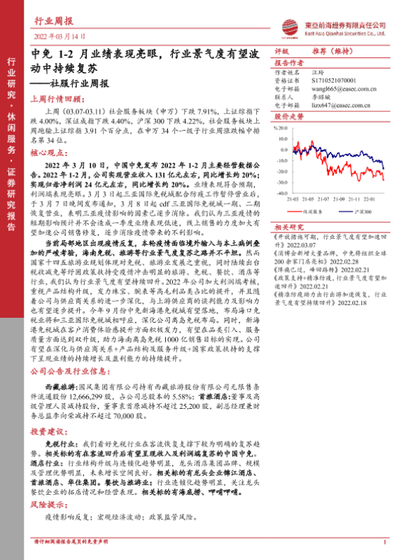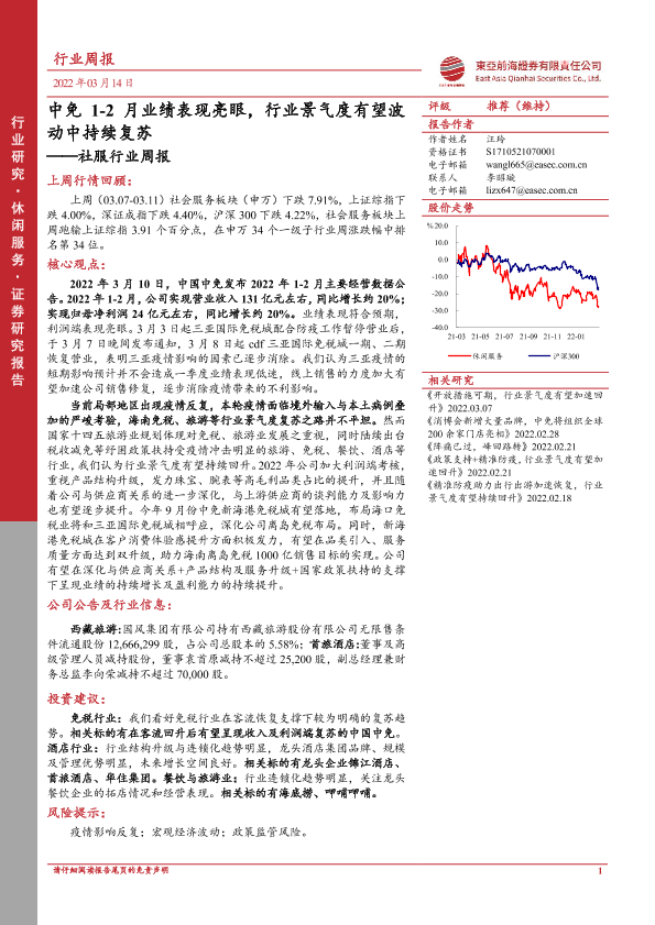 【东亚前海证券】【20220314】社服行业周报:中免1-2月业绩表现亮眼,行业景气度有望波动中持续复苏-14页
