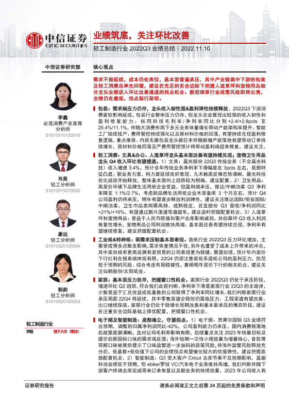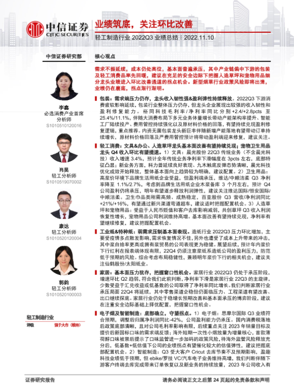 【中信证券】【20221110】轻工制造行业2022Q3业绩总结:业绩筑底,关注环比改善-25页