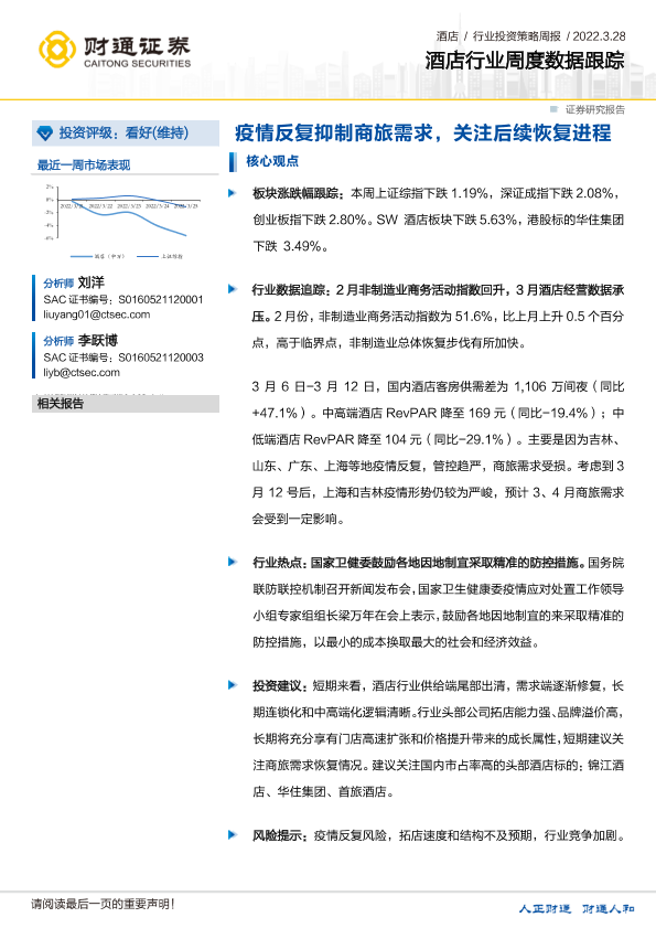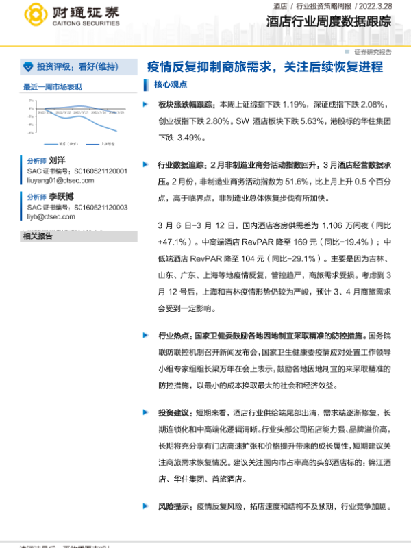 【财通证券】【20220328】酒店行业周度数据跟踪:疫情反复抑制商旅需求,关注后续恢复进程-13页