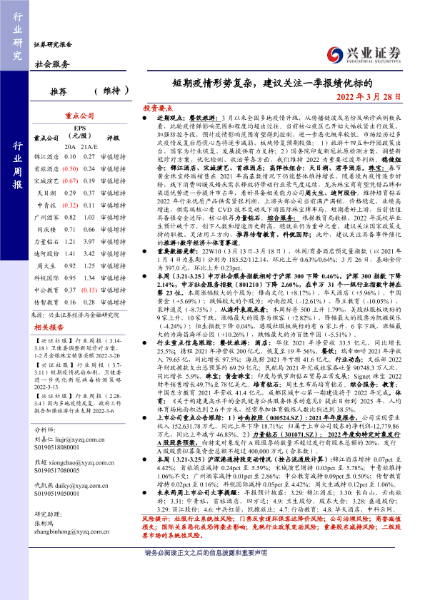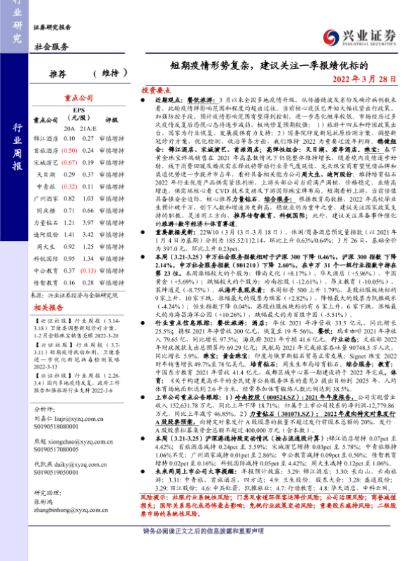 一季度报 投资建议 旅游 疫情 社会服务