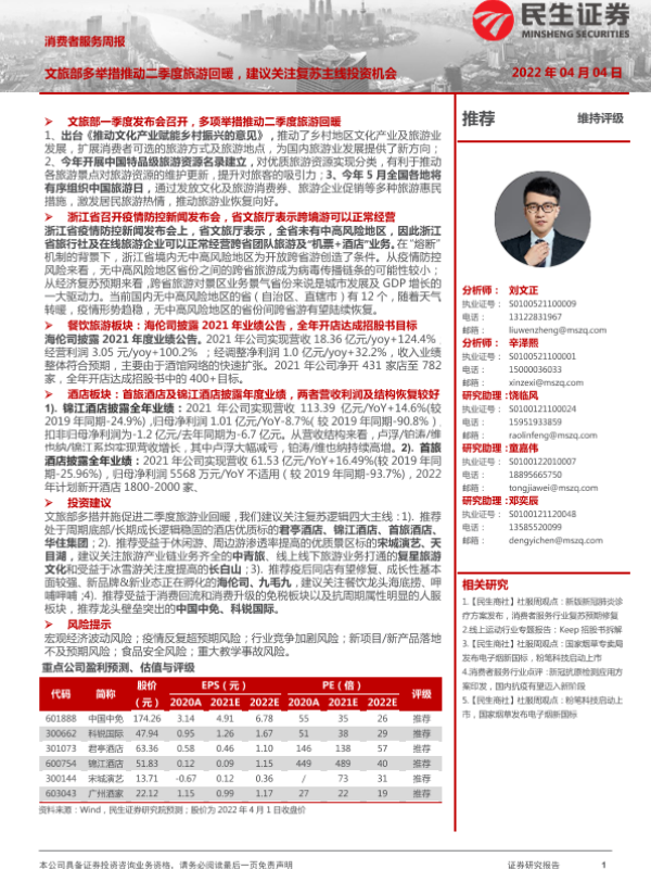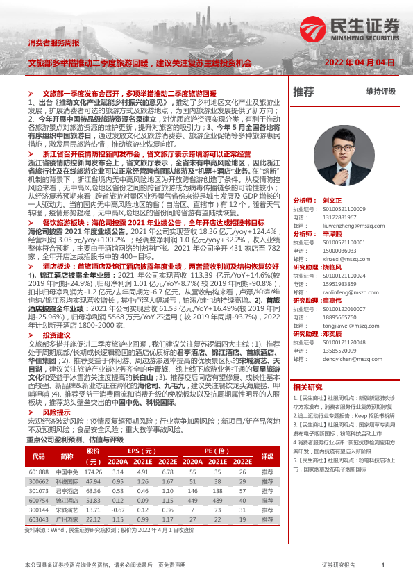 【民生证券】【20220404】消费者服务周报:文旅部多举措推动二季度旅游回暖,建议关注复苏主线投资机会-36页