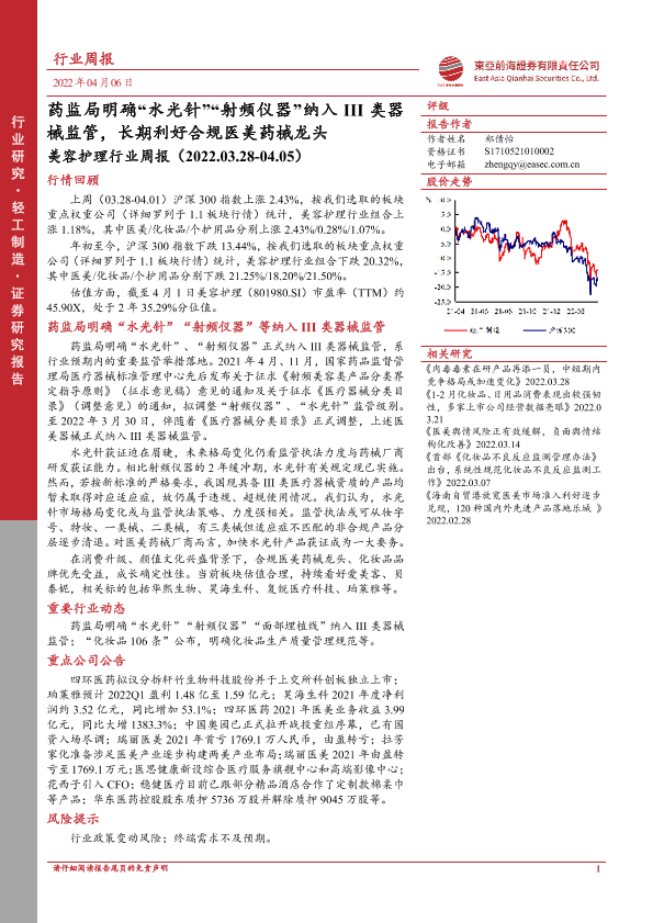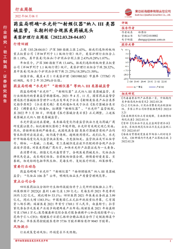 【东亚前海证券】【20220406】美容护理行业周报:药监局明确“水光针”“射频仪器”纳入III类器械监管-12页