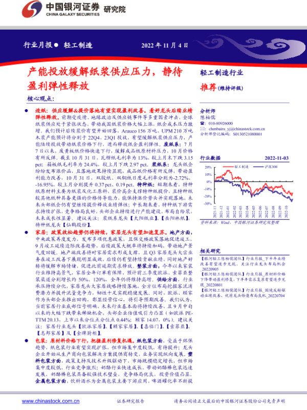 【银河证券】【20221104】轻工制造行业月报:产能投放缓解纸浆供应压力,静待盈利弹性释放-23页