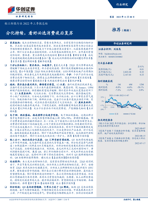 【华创证券】【20221108】轻工纺服行业2022年三季报总结:分化持续,看好必选消费疫后复苏-39页