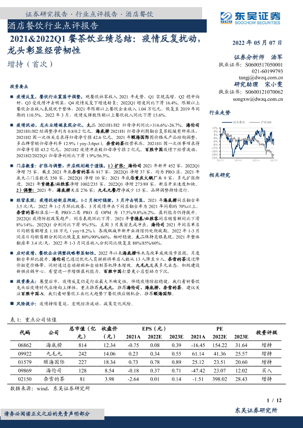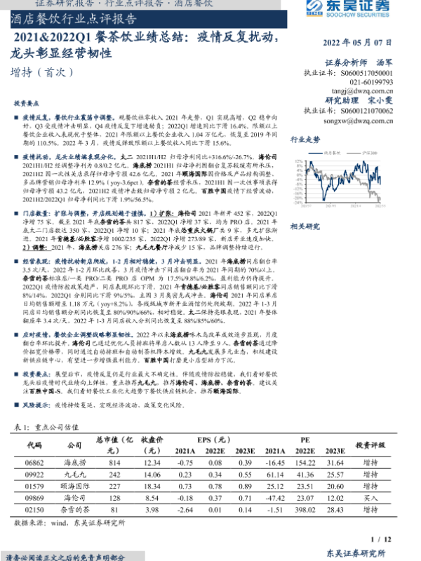 【东吴证券】【20220507】2021&2022Q1餐茶饮业绩总结:疫情反复扰动,龙头彰显经营韧性-12页