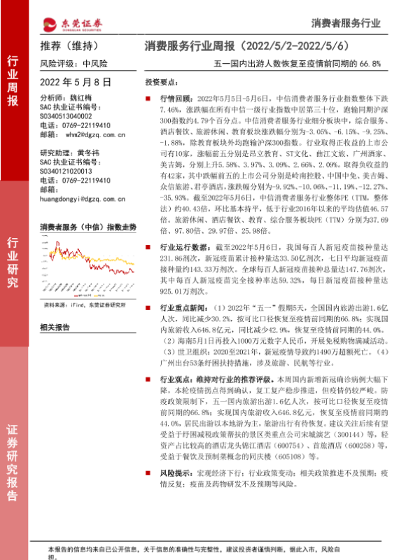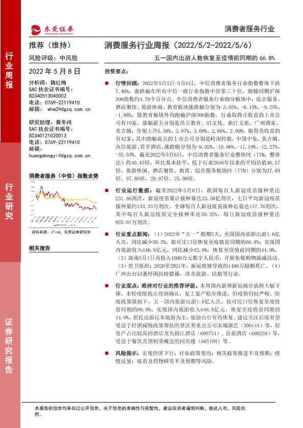 【东莞证券】【20220508】消费服务行业周报:五一国内出游人数恢复至疫情前同期的66.8%-9页
