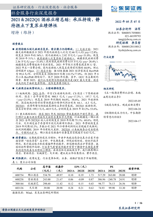 【东吴证券】【20220507】2021&2022Q1酒旅业绩总结:承压持续,静待拐点下复苏业绩弹性-16页