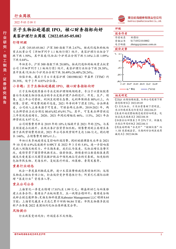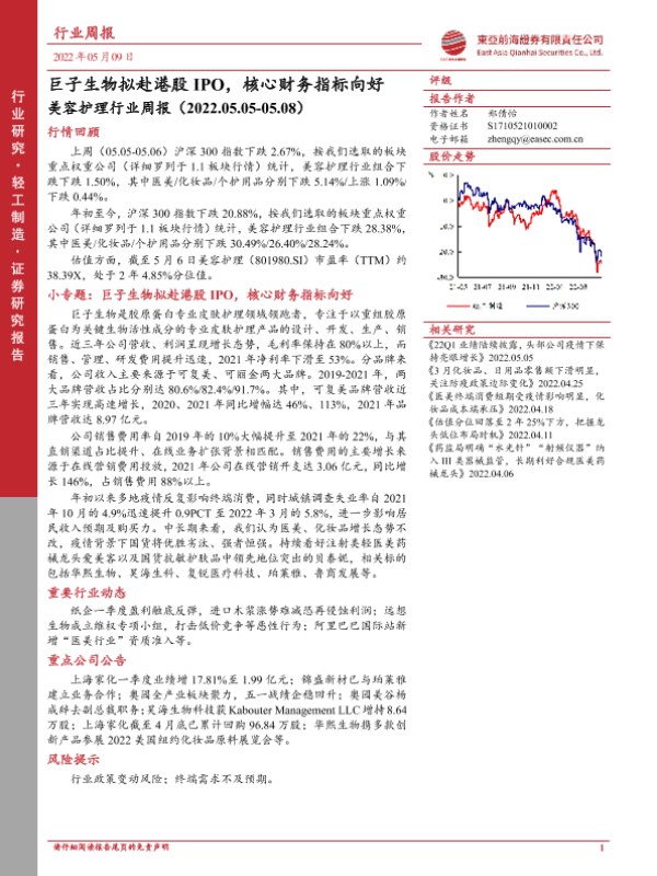 【东亚前海证券】【20220509】美容护理行业周报:巨子生物拟赴港股IPO,核心财务指标向好-15页