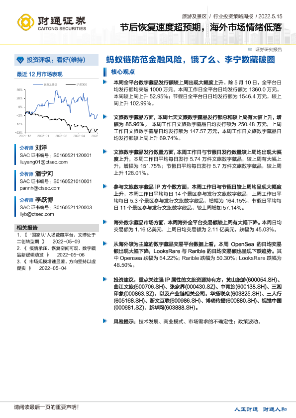 市场分析 投资策略 数字藏品 旅游行业 景区恢复