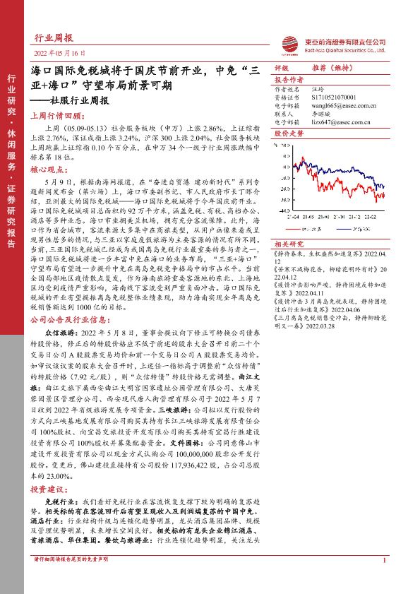 【东亚前海证券】【20220516】社服行业周报:海口国际免税城将于国庆节前开业,中免“三亚+海口”守望布局前景可期-18页