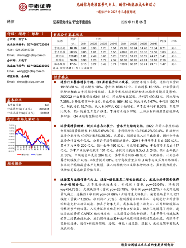 【中泰证券】【20221105】通信行业2022年三季报综述:光通信与连接器景气向上,通信+新能源成长新动力-35页