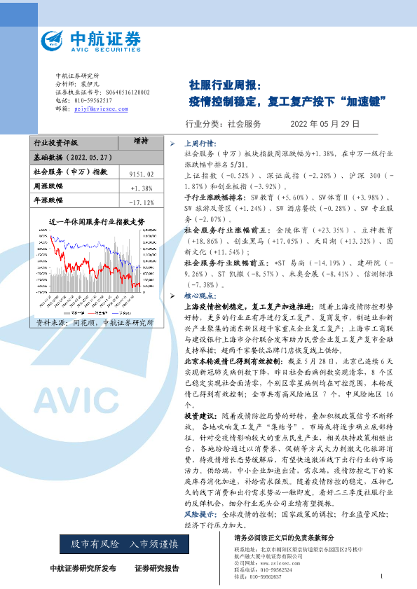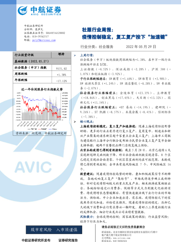 【中航证券】【20220529】社服行业周报:疫情控制稳定,复工复产按下“加速键”-9页