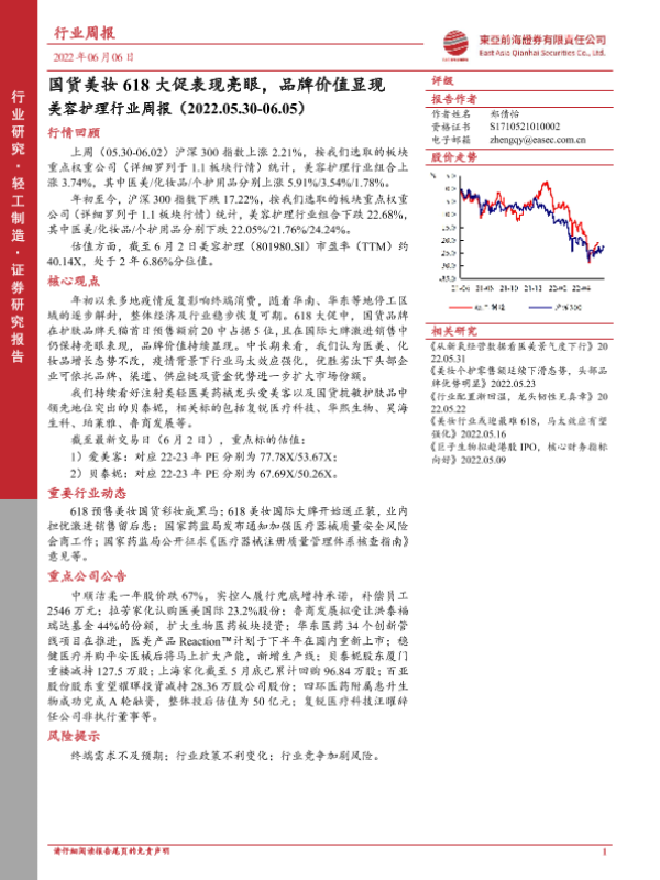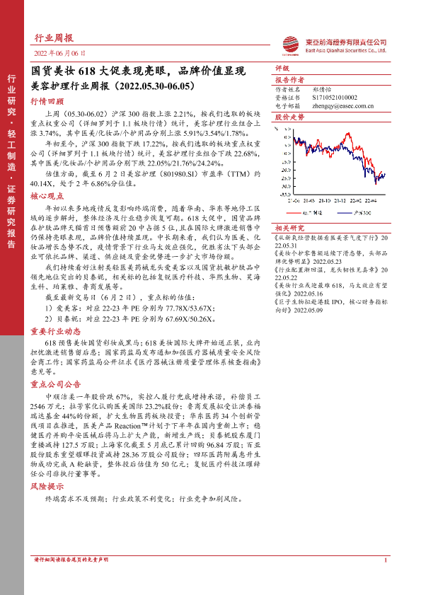 【东亚前海证券】【20220606】美容护理行业周报:国货美妆618大促表现亮眼,品牌价值显现-12页
