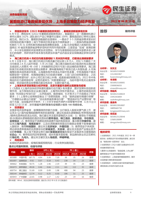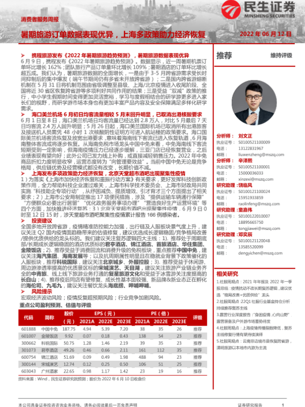 【民生证券】【20220612】消费者服务周报:暑期旅游订单数据表现优异,上海多政策助力经济恢复-23页