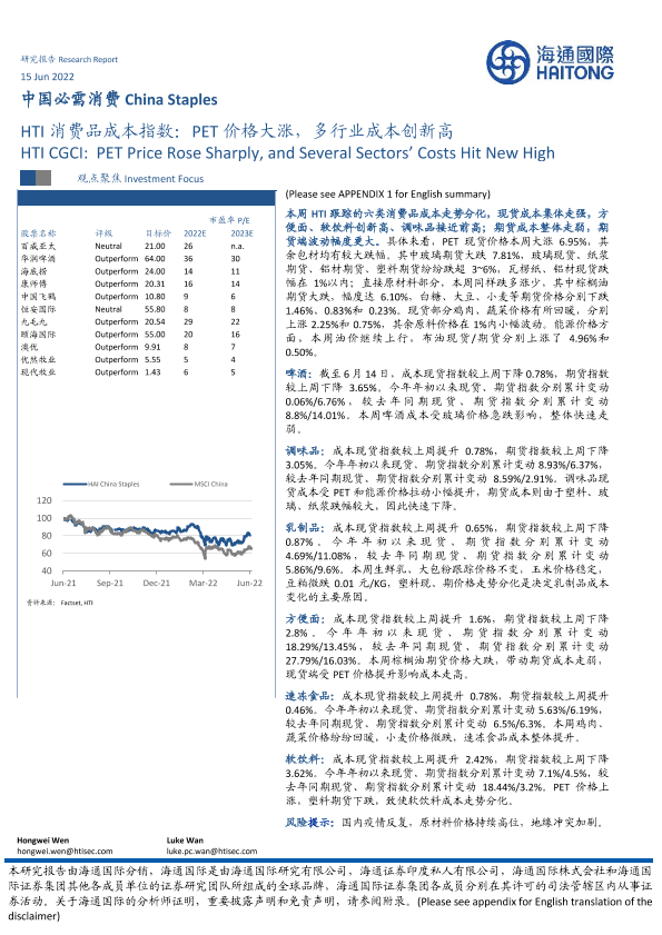 【海通国际】【20220615】HTI消费品成本指数:PET价格大涨,多行业成本创新高-16页