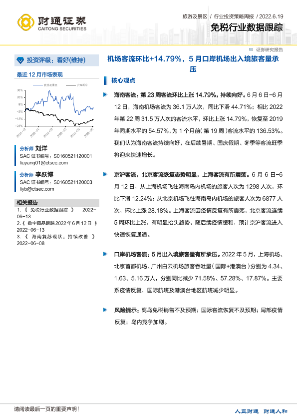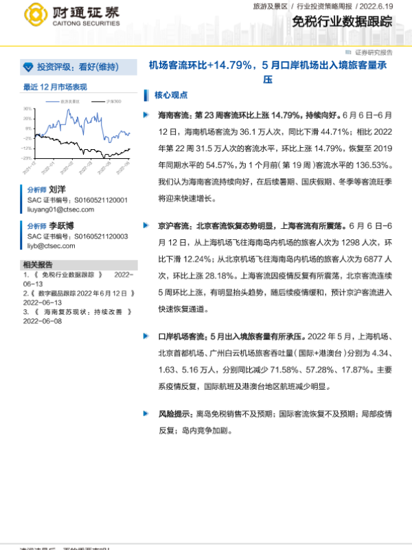 【财通证券】【20220619】免税行业数据跟踪:机场客流环比+14.79%,5月口岸机场出入境旅客量承压-12页