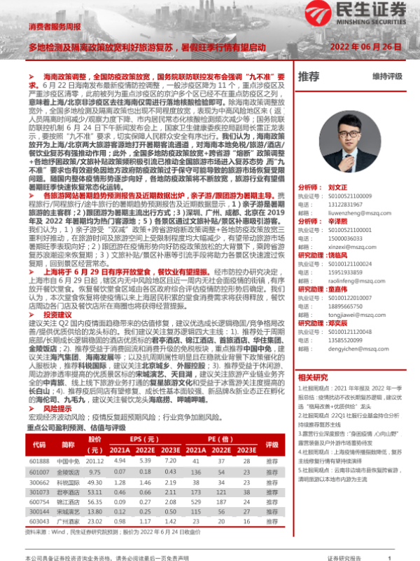 【民生证券】【20220626】多地检测及隔离政策放宽利好旅游复苏,暑假旺季行情有望启动-23页