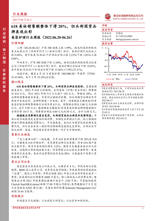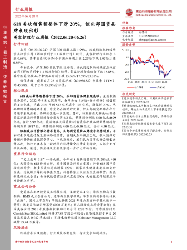 【东亚前海证券】【20220628】618美妆销售额整体下滑20%,但头部国货品牌表现出彩-13页