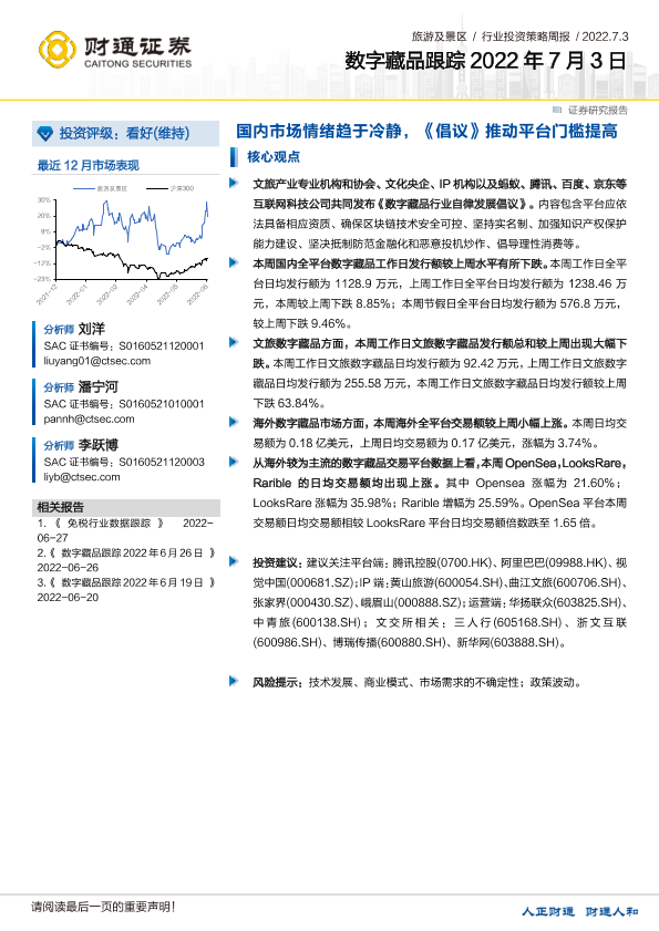 【财通证券】【20220703】旅游及景区行业投资策略周报:数字藏品跟踪-国内市场情绪趋于冷静,《倡议》推动平台门槛提高-10页