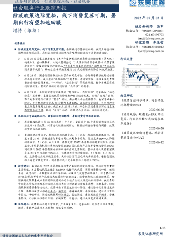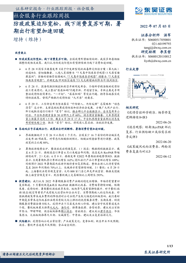 【东吴证券】【20220703】社会服务行业跟踪周报:防疫政策边际宽松,线下消费复苏可期,暑期出行有望加速回暖-13页