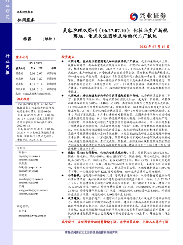 【兴业证券】【20220710】美容护理双周刊:化妆品生产新规落地,重点关注困境反转的代工厂板块-17页