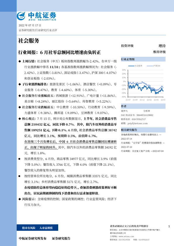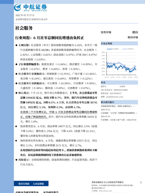 【中航证券】【20220717】社会服务行业周报:6月社零总额同比增速由负转正-10页