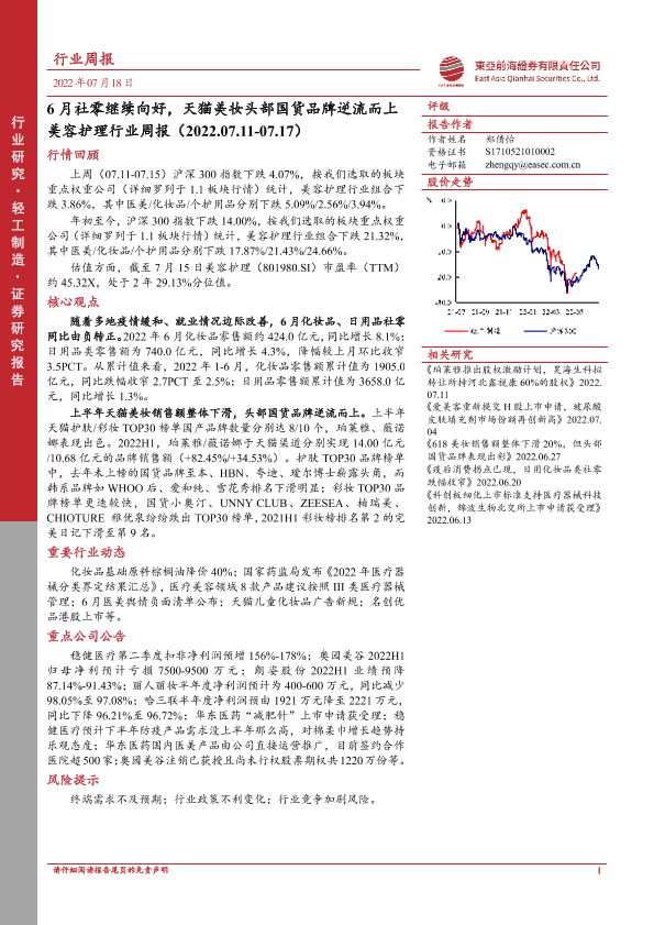 【东亚前海证券】【20220718】6月社零继续向好,天猫美妆头部国货品牌逆流而上-15页