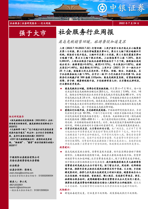 【中银证券】【20220724】社会服务行业周报:离岛免税销售回暖,旅游餐饮加速复苏-28页