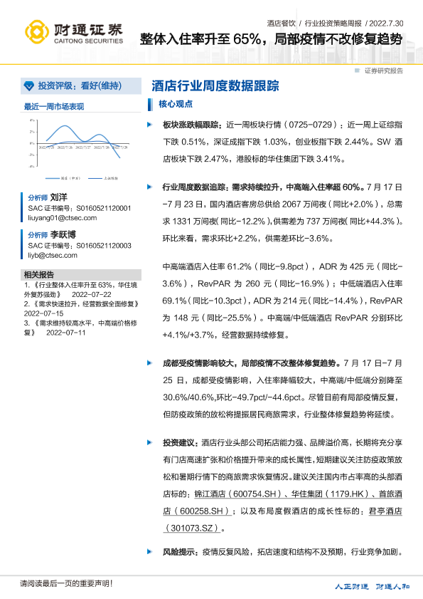 【财通证券】【20220730】酒店餐饮行业投资策略周报:整体入住率升至65%,局部疫情不改修复趋势-10页