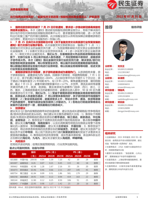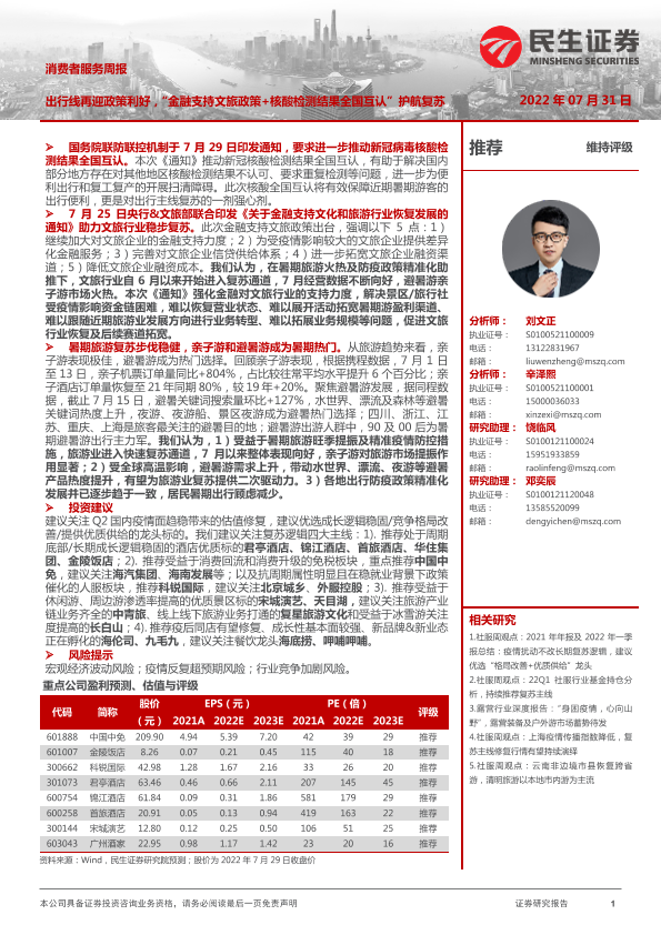 【民生证券】【20220731】消费者服务周报:出行线再迎政策利好,“金融支持文旅政策+核酸检测结果全国互认”护航复苏-25页