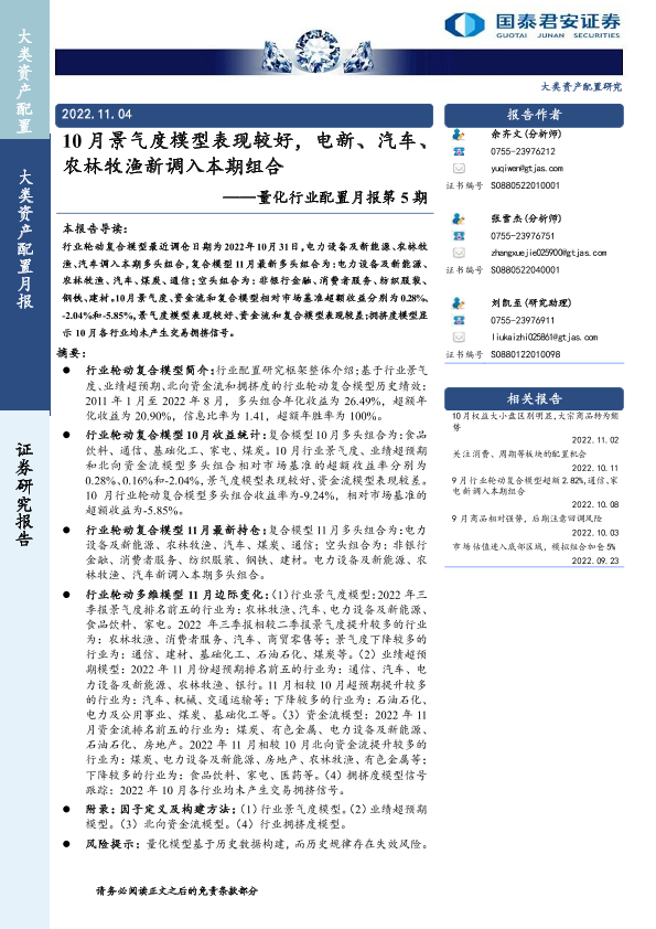 【国泰君安证券】【20221104】量化行业配置月报第5期:10月景气度模型表现较好,电新、汽车、农林牧渔新调入本期组合-16页