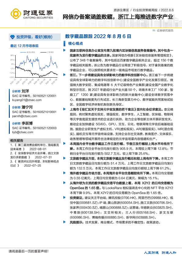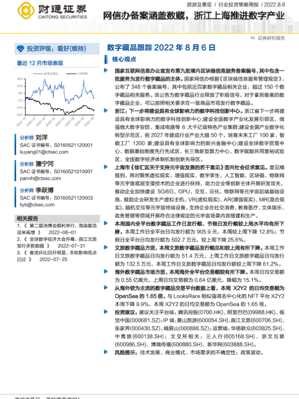 【财通证券】【20220806】旅游及景区行业投资策略周报:网信办备案涵盖数藏,浙江上海推进数字产业-12页