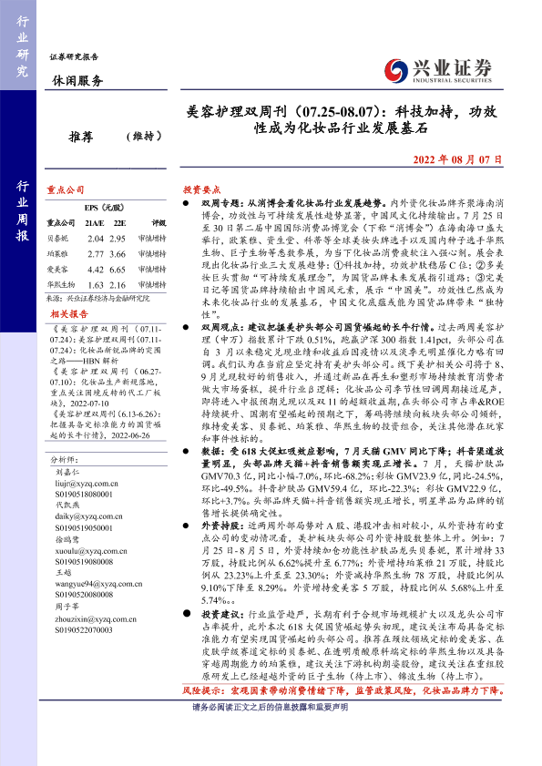 【兴业证券】【20220807】美容护理双周刊:科技加持,功效性成为化妆品行业发展基石-24页