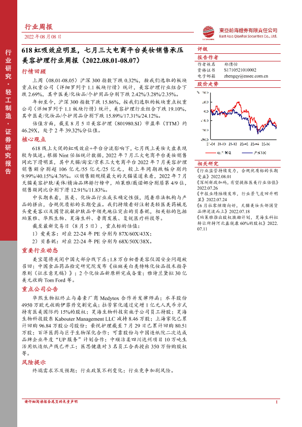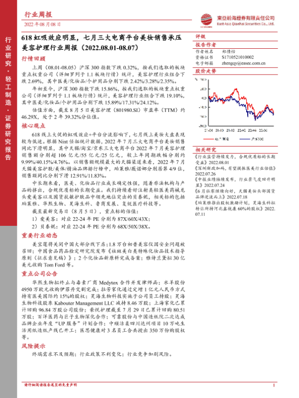 【东亚前海证券】【20220808】美容护理行业周报:618虹吸效应明显,七月三大电商平台美妆销售承压-13页