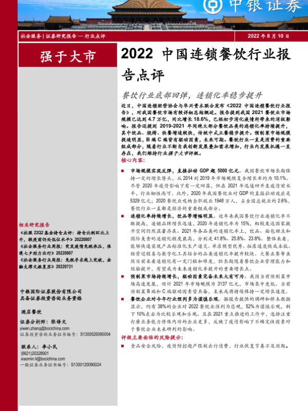 【中银证券】【20220810】2022中国连锁餐饮行业报告点评:餐饮行业底部回弹,连锁化率稳步提升-8页