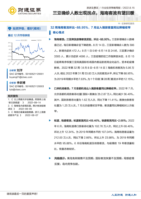 【财通证券】【20220815】旅游及景区行业投资策略周报:三亚确诊人数出现拐点,海南客流有望回暖-15页