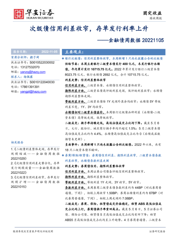 【华安证券】【20221105】金融债周数据:次级债信用利差收窄,存单发行利率上升20221105-20页