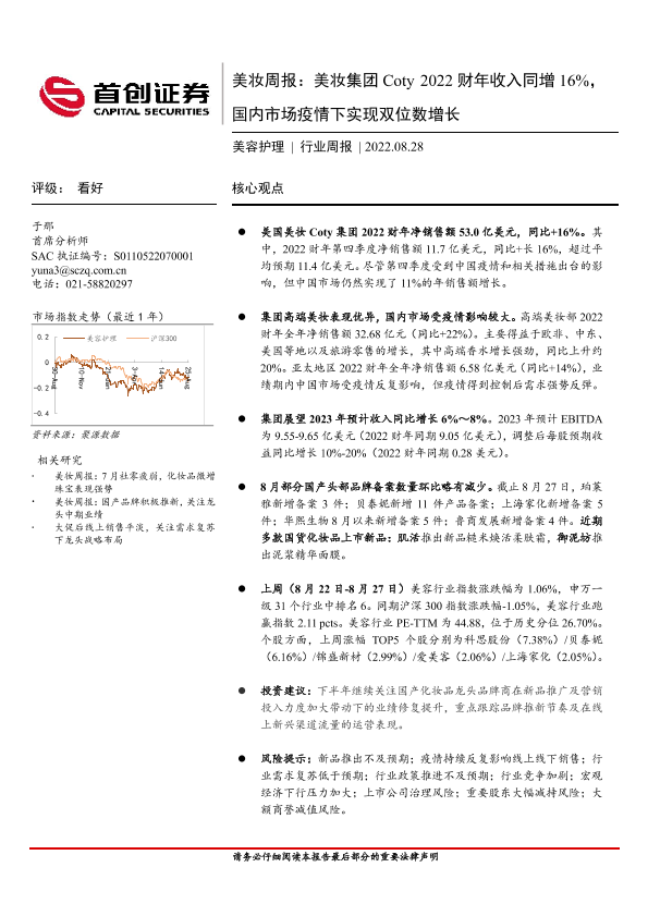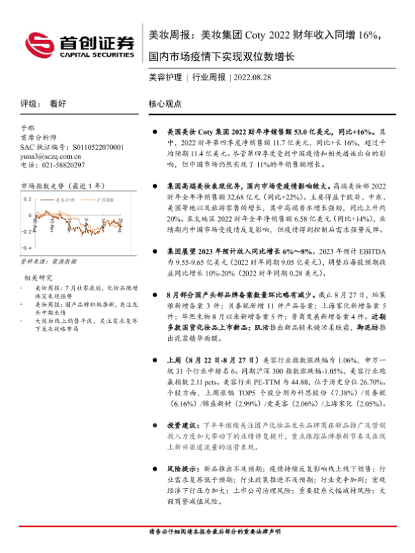 【首创证券】【20220828】美妆集团Coty 2022财年收入同增16%,国内市场疫情下实现双位数增长-10页