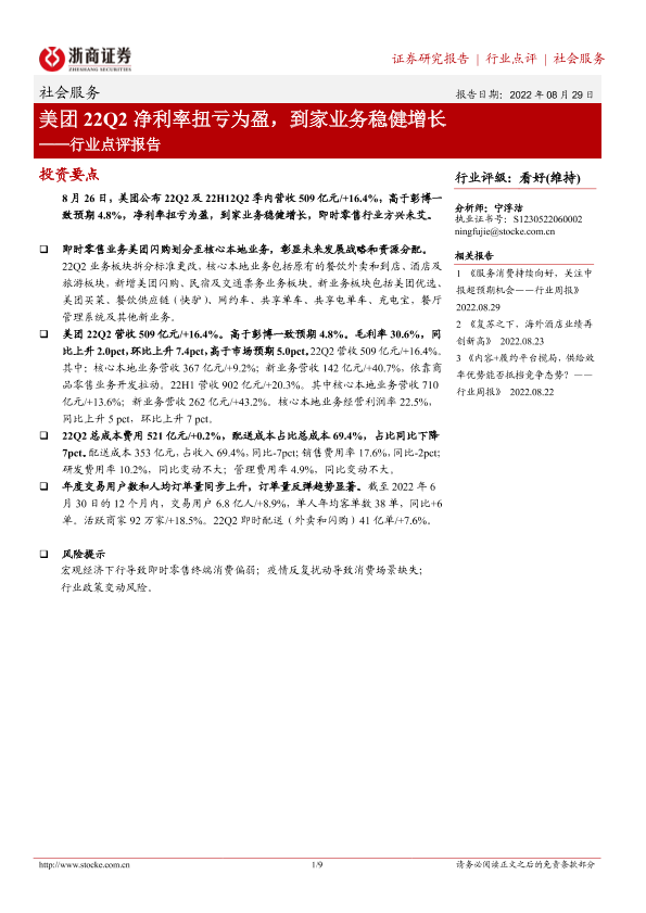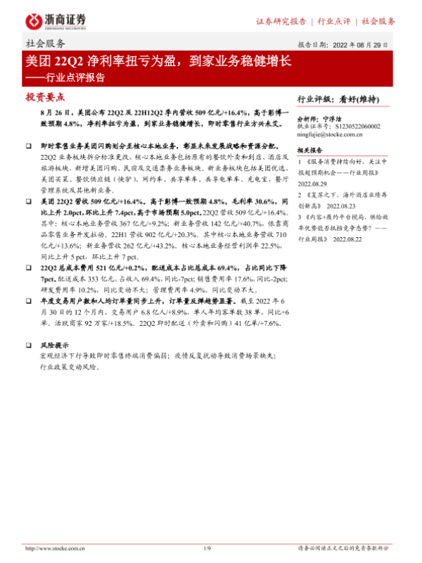 【浙商证券】【20220829】美团22Q2净利率扭亏为盈,到家业务稳健增长-9页