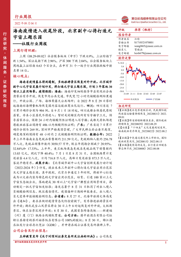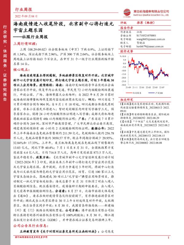 【东亚前海证券】【20220904】社服行业周报:海南疫情进入收尾阶段,北京副中心将打造元宇宙主题乐园-15页