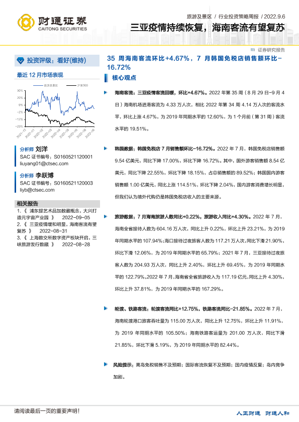 【财通证券】【20220906】旅游及景区行业投资策略周报:三亚疫情持续恢复,海南客流有望复苏-18页