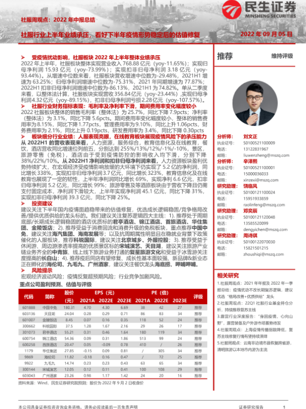 【民生证券】【20220905】2022年中报总结:社服行业上半年业绩承压,看好下半年疫情形势稳定后的估值修复-28页