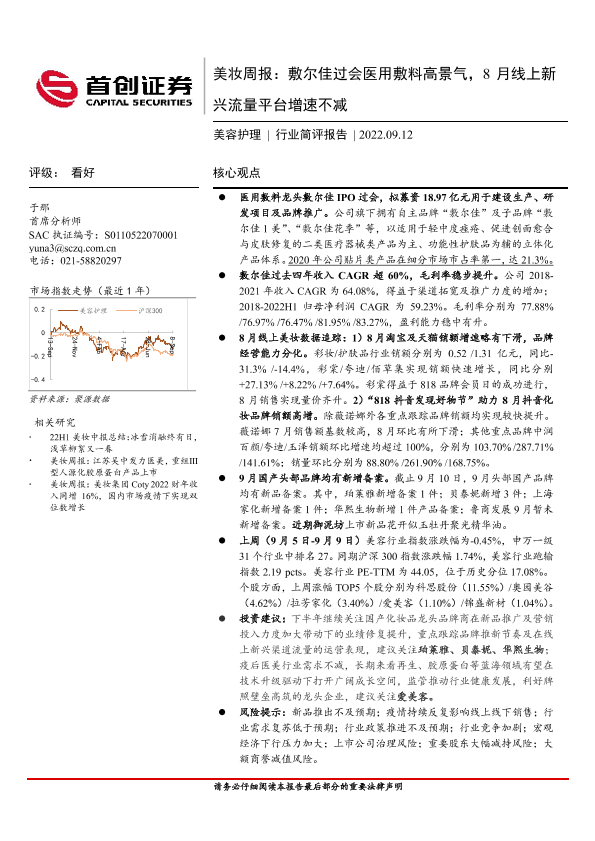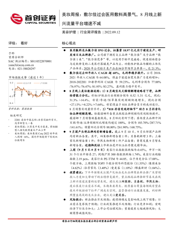 【首创证券】【20220912】美妆周报:敷尔佳过会医用敷料高景气,8月线上新兴流量平台增速不减-21页
