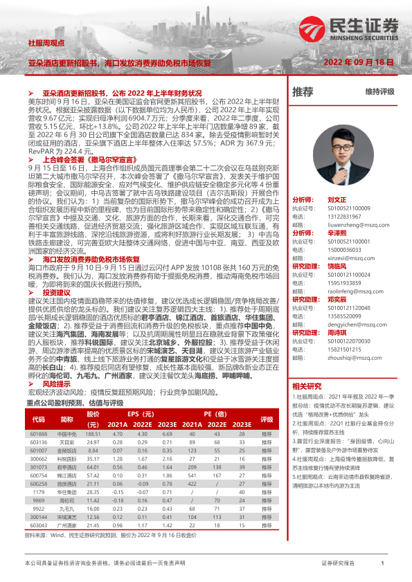 【民生证券】【20220918】社服周观点:亚朵酒店更新招股书,海口发放消费券助免税市场恢复-23页