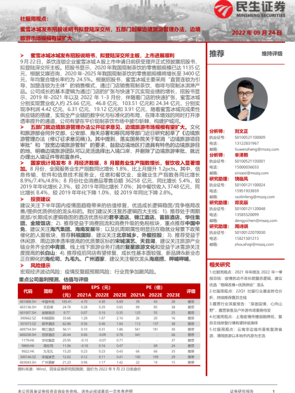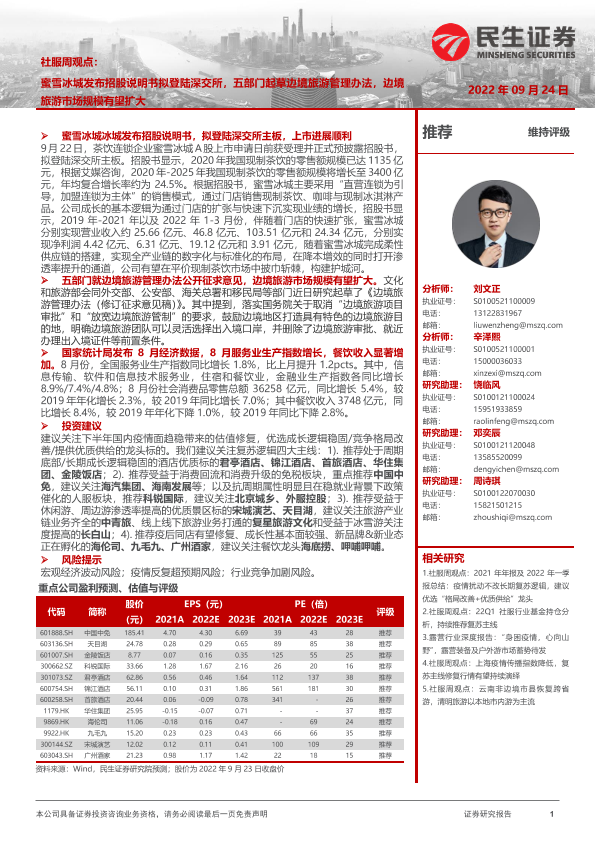 【民生证券】【20220924】社服行业周观点:蜜雪冰城发布招股说明书拟登陆深交所,五部门起草边境旅游管理办法-21页