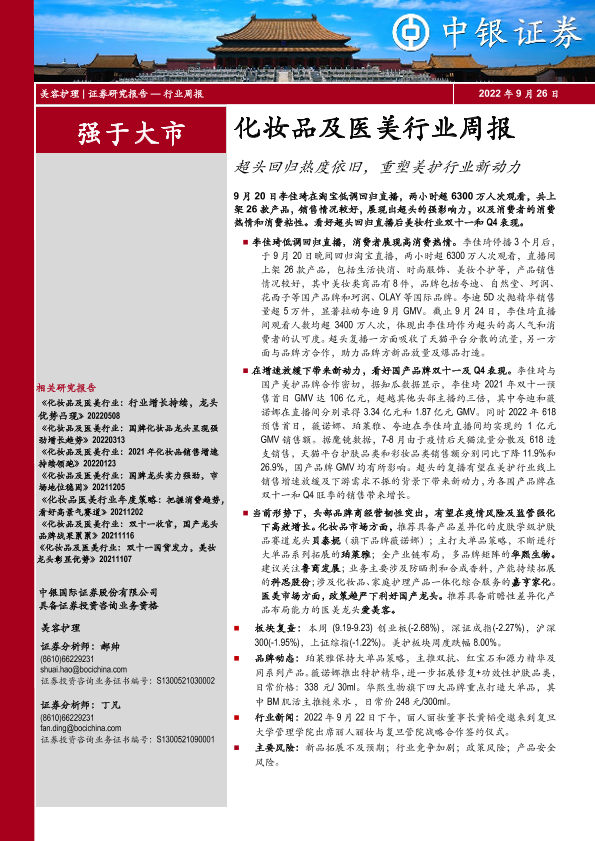 【中银证券】【20220926】化妆品及医美行业周报:超头回归热度依旧,重塑美护行业新动力-16页